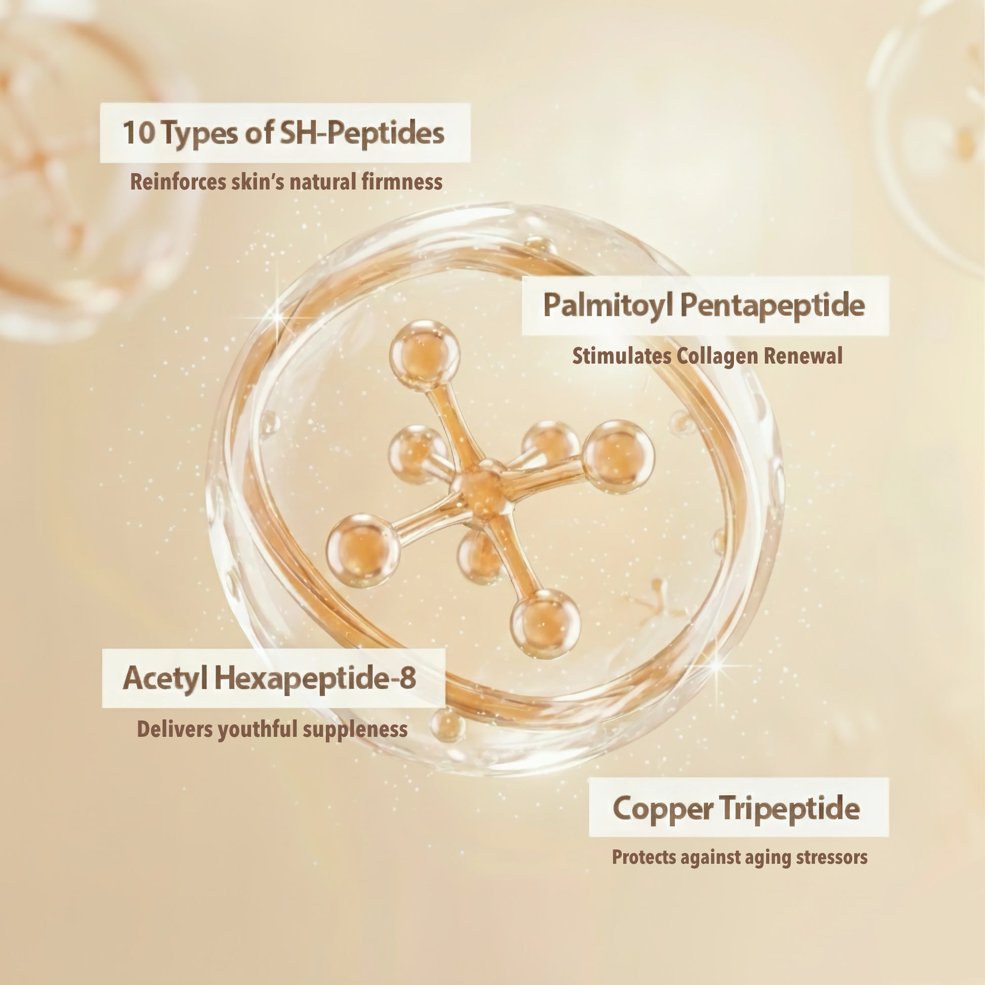 Silk peptides are small, easily absorbed protein molecules rich in amino acids that mimic the structure of skin's natural proteins. They create a weightless, tightening film on the skin's surface while deeply nourishing, which helps to visibly smooth and firm sagging areas. This action supports improved elasticity and a more defined facial contour over time.